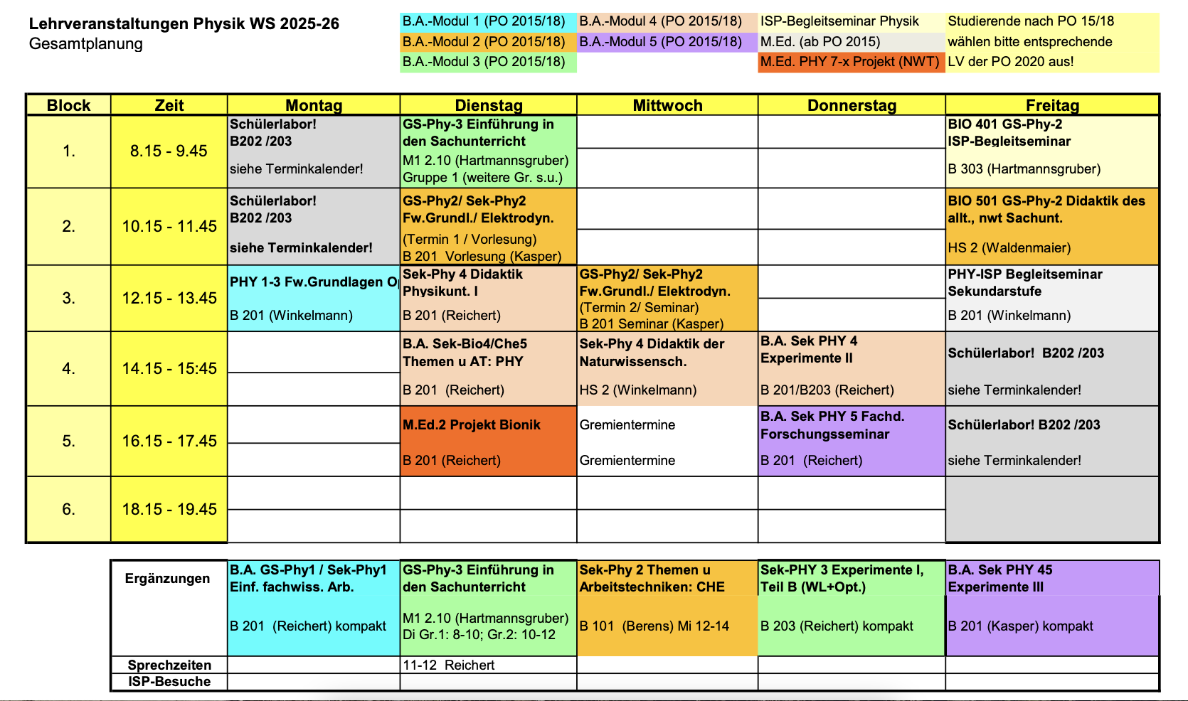 Die Lehrveranstaltungen für Studierende nach StO-Fassung von 2015, 2018 und 2020 wurden nicht getrennt ausgewiesen. Bitte informieren Sie sich im Studienführer Physik (PO F.v. 2015), Studienführer Physik (PO F.v. 2018) bzw. Studienführer Physik (PO F.v. 2020), welche Veranstaltungen für Sie relevant sind. Bei Unklarheiten wenden Sie sich bitte an die Lehrenden im Fach Physik.